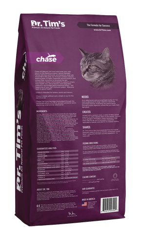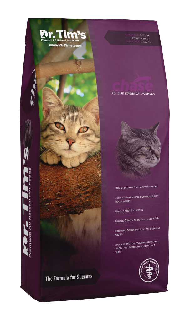 Chase Cat Food has been formulated through the combined efforts of a Ph.D. animal nutritionist and a practicing small animal veterinarian.