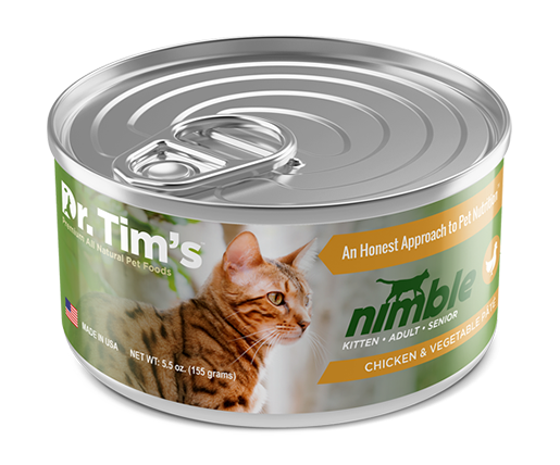Designed for the cat that thrives on canned food, Dr. Tim's Nimble Chicken and Vegetable Pate provides a high quality, low carbohydrate alternative to dry food. Each can includes a delicious variety of fruits and vegetables to provide your cat with plenty of antioxidants, and omega-3 and omega-6 fatty acids to help with brain health, inflammation issues and skin and coat health. This recipe also contains glucosamine and chondroitin for bone and joint support, as well as vitamin A and essential amino acids that allow your cat to lead a healthy, active life.