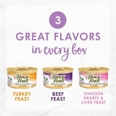 Mix up mealtime for your furry friend with the Purina Fancy Feast Sliced Poultry & Beef Collection Gourmet wet cat food variety pack. She gets three delicious flavors, including Sliced Chicken Hearts & Liver Feast, Sliced Turkey Feast, and Sliced Beef Feast, to feed her meaty cravings. Each delightful bite is designed with all your cat's nutritional needs in mind, containing high-quality ingredients that are sure to please both you and your cat. Let her indulge her appetite in a dish of this wet cat food that offers 100% complete and balanced nutrition while tantalizing her palate with a combination of tender, easy-to-eat slices swimming in a savory gravy. From her beginnings as a tiny kitten through an active adult life, Purina Fancy Feast Sliced Poultry & Beef Collection canned cat food offers everything your favorite feline needs to keep her well-nourished and ready for another enjoyable day spending time with you.