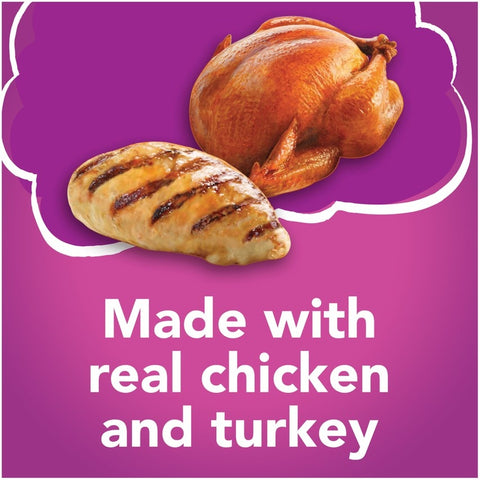Give your kitten or adult cat the nutrition she needs and the taste that she craves with this Purina Friskies Poultry wet cat food variety pack. Every recipe in this variety pack is formulated to deliver the complete and balanced nutrition necessary to be a part of your cat's overall good health. In this pack, the Prime Filets with Chicken in Gravy combines thin-sliced morsels of delicious chicken with added vitamins A, E and D-3 to promote the healthy growth of kittens and to help maintain the good health of your adult cat. Prime Filets Turkey Dinner in Gravy has a similar texture to the chicken recipe, but with the rich and hearty turkey flavor she can't get enough of. This delicious variety has the added vitamins and minerals to support overall good health for cats of any age. Savory Shreds Turkey & Cheese Dinner in Gravy tosses in a little variety in texture, and it introduces a pleasant taste of cheese to your cat's regular fare. It also has an added supplement to help your cat get the vitamin B-12 she needs from a meal. Meaty Bits Chicken Dinner in Gravy combines chicken and liver in a blend of hefty morsels that's enriched with vitamins and minerals to promote overall good health. Try combining daily meals of this flavor with Friskies Tender & Crunchy Combo dry food for even more dinnertime variety. Caring for your cat's nutritional needs is just one of the ways you show her how much you care. We care too, which is why all of our products are made in Purina-owned facilities in the United States and are put through exhaustive quality control to ensure they meet or exceed state and federal guidelines for pet food. Our ingredients are chosen for their quality and nutritional value, so that you can be confident you're feeding your cat the very best with every bite. Because it's not just what you feed your cat, it's what we feed our own.