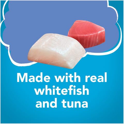Quench your cat's cravings for seafood flavor when you serve Purina Friskies Shreds With Ocean Whitefish & Tuna in Sauce wet cat food. Real chicken and salmon deliver the taste she loves while letting you feel good about giving her a meal made with high-quality ingredients. Each bite features tender shreds for a texture she can sink her teeth into, and a savory sauce balances out the recipe, providing added moisture and flavor. Let the delicious aroma guide her to you at mealtime, and watch as she happily nibbles her way to a satisfied belly. With 100% complete and balanced nutrition for adult cats and kittens, this Purina Friskies Shreds recipe can follow her through every stage of life for consistency in her daily diet. Show your cat she's the center of your world when you fill her dish with this mouthwatering wet cat food variety.