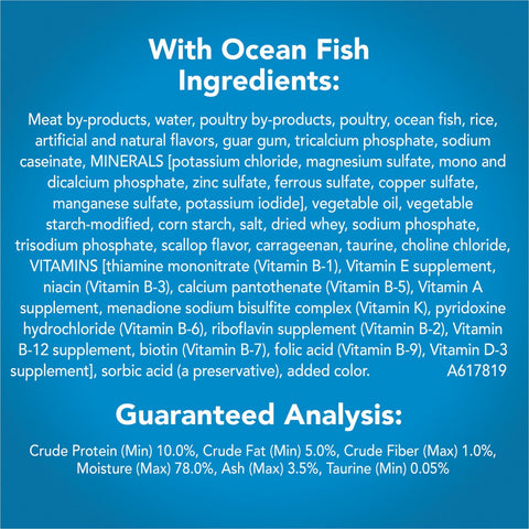 Water, Ocean Fish, Meat By-Products, Liver, Chicken By-Products, Cheese, Rice, Artificial And Natural Flavors, Guar Gum, Minerals [Potassium Chloride, Mono And Dicalcium Phosphate, Magnesium Sulfate, Zinc Sulfate, Ferrous Sulfate, Copper Sulfate, Manganese Sulfate, Potassium Iodide], Sodium Caseinate, Vegetable Oil, Vegetable Starch-Modified, Added Color, Corn Starch, Salt, Tricalcium Phosphate, Dried Whey, Carrageenan, Vitamins [Vitamin E Supplement, Thiamine Mononitrate (Vitamin B-1), Niacin (Vitamin B-3), Calcium Pantothenate (Vitamin B-5), Vitamin A Supplement, Menadione Sodium Bisulfite Complex (Vitamin K), Pyridoxine Hydrochloride (Vitamin B-6), Riboflavin Supplement (Vitamin B-2), Vitamin B-12 Supplement, Biotin (Vitamin B-7), Folic Acid (Vitamin B-9), Vitamin D-3 Supplement], Choline Chloride, Taurine, Sorbic Acid (A Preservative).Guaranteed Analysis