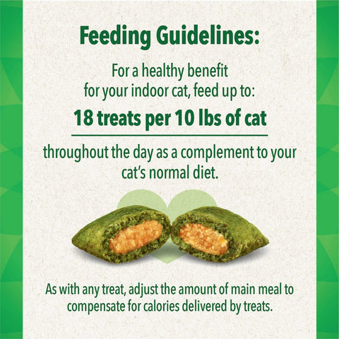 FELINE GREENIES SMARTBITES Hairball Control Treats for Cats are the perfect treat to keep your cat purring all day long. Designed by veterinarians and created with GREENIES FIBERBLEND Formula, these treats help minimize and control hairball formation and support healthy digestion in your adult cat when fed in conjunction with a hairball control diet. Featuring a mix of crunchy and creamy textures, these cat snacks have less than 2 calories, and added vitamins, minerals, and other nutrients for a nutritionally complete and balanced snack. Plus, these irresistible little treats come in a delectable chicken flavor and are made with natural ingredients, plus vitamins. These FELINE GREENIES are the healthy, tasty hairball control treats your cat will love.