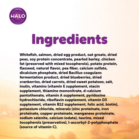 Whitefish, salmon, dried egg product, oat groats, dried peas, soy protein concentrate, pearled barley, chicken fat (preserved with mixed tocopherols), potato protein, flaxseed, natural flavor, pea fiber, calcium sulfate, dicalcium phosphate, dried Bacillus coagulans fermentation product, dried blueberries, dried cranberries, dried carrots, dried sweet potatoes, salt, inulin, vitamins (vitamin E supplement, niacin supplement, thiamine mononitrate, d-calcium pantothenate, vitamin A supplement, pyridoxine hydrochloride, riboflavin supplement, vitamin D3 supplement, vitamin B12 supplement, folic acid, biotin), potassium chloride, minerals (zinc proteinate, iron proteinate, copper proteinate, manganese proteinate, sodium selenite, calcium iodate), taurine, mixed tocopherols (preservative), l-ascorbyl-2-polyphosphate (source of vitamin C).