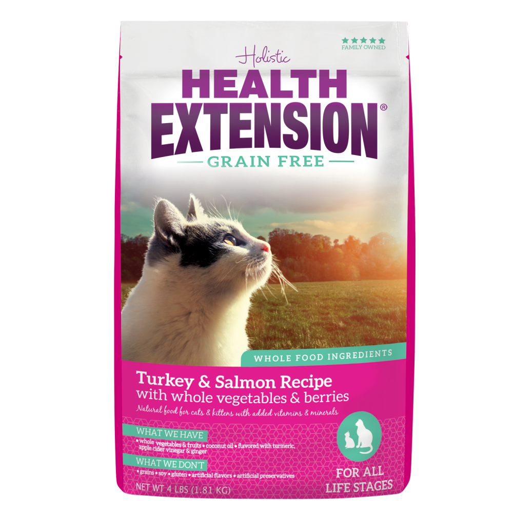 Holistic Health Extension is proud to announce our newest variety: 100% GRAIN FREE for Kittens & Cats – Salmon & Turkey. By feeding this natural, super-premium food you have realized that your cat’s health is directly linked to the quality of the food you feed. Holistic Health Extension ingredients have been carefully chosen for its nutritional benefits providing just what your feline friend needs for a healthy life. We have been offering Health Extension for over 10 years as a healthy, palatable alternative in pet nutrition. We are proud to offer you our Kitten & Adult Cat food formulated with the same high standards.