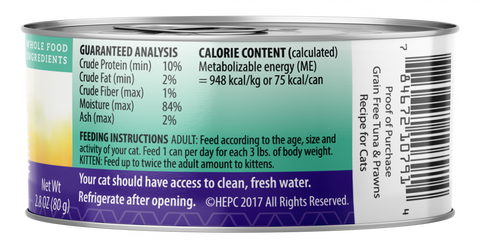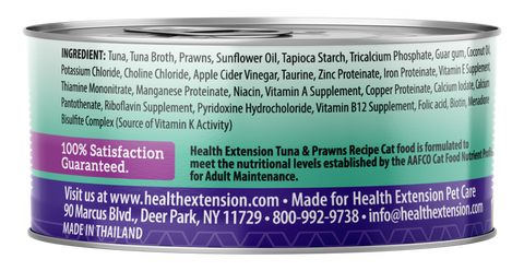 The Health Extension Grain-Free Tuna & Prawns Recipe Canned Cat Food nourishes your feline with every single bite. Made to provide years of soft purrs and gentle nuzzles, this holistic recipe is specially formulated to promote a shiny coat, resilient immune system, flexible joints, and strong bones. It’s chock full of vitamins and nutrients that also maintain a healthy urinary tract, and your cat will love the tuna and prawn flavors with rich fruits and vegetables—and you’ll feel great about giving him paw-some food.
