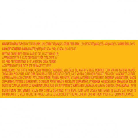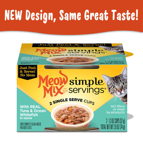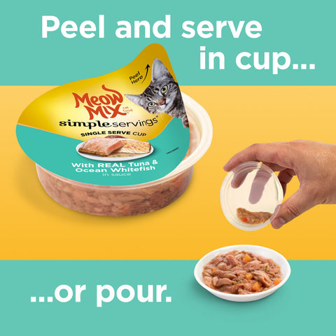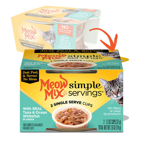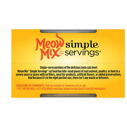 Simplify your life – and satisfy your cat – with Meow Mix® Simple Servings™ wet cat food: single servings of delicious wet cat food in convenient, mess-free cups. Your adult cat gets 100% complete and balanced nutrition and you get specially designed, easy-to-open, easy-to-serve meals in pre-portioned 1.3 oz packages. No mess. No leftovers. So simple!