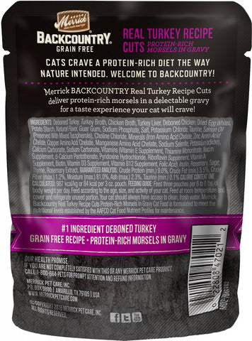 Merrick Backcountry Grain Free Real Turkey Cuts Recipe Cat Food Pouch offers a protein rich food that cats will thrive on. With complete, balanced nutrition along with the proper amount of moisture, Merrick Backcountry Grain Free Real Turkey Cuts Recipe Cat Food Pouch is the perfect addition to any cat’s diet. Real chunks of turkey are the first ingredient that makes up this delicious recipe topped with a tasty gravy any cat is sure to love. As with all of Merrick’s recipes, their ingredients are sourced fresh and locally with no added artificial colors, flavors, or preservatives.