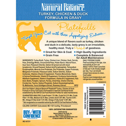 Natural Balance Platefull's Cat Food Pouches are tasty treats packed with all the nutrients your cat needs. Platefull's Cat Food Pouches are formulated to provide your pet with a healthy and balanced meal in many great flavors. Entirely grain-free, this food is made specially to help your pet enjoy every bite without worrying about sensitive digestion. Made to boost your cat's energy, Natural Balance Platefull's Cat Food Pouches are a delicious way to a strong, healthy body.