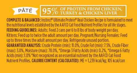 Instinct Ultimate Protein Grain-Free Chicken Formula Canned Cat Food was created to mimic the meals of your cat's mighty ancestors. Packed with high quality proteins and hearty fruits and vegetables for a complete and balanced diet, and free of fillers like grains and gluten, every bite contains 95% real chicken and liver for a nutrient dense and naturally delicious loaf. Plus added omega fatty acids help keep your cat's coat looking shiny and healthy. With an unmatched savory deliciousness, Instinct Ultimate Protein is everything your cat wants, and nothing they don't.
