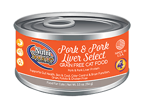 Offering a high quality, holistic recipe, NutriSource Grain Free Pork & Pork Liver Select Canned Cat Food is an easy to digest pate your cat is sure to love! This recipe also has added prebiotics and highly digestible minerals for immune and growth support. Nutrisource recipes always include their Good 4 Life system with ingredients that work together to promote gut health often showing health improvements within the first feeding!