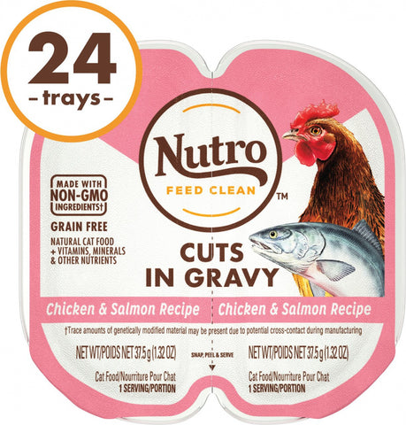 NUTRO PERFECT PORTIONS Adult Cat Food Trays allow you to feed your cat wet cat food without the mess of leftovers in your refrigerator. Made with real chicken as the first ingredient, this grain-free cat food contains no artificial flavors, colors or preservatives – only high-quality ingredients and nutrition in every serving. With NUTRO PERFECT PORTIONS Adult Cat Real Chicken & Salmon Cuts In Gravy Recipe Cat Food Trays, your cat gets a fresh meal every time.