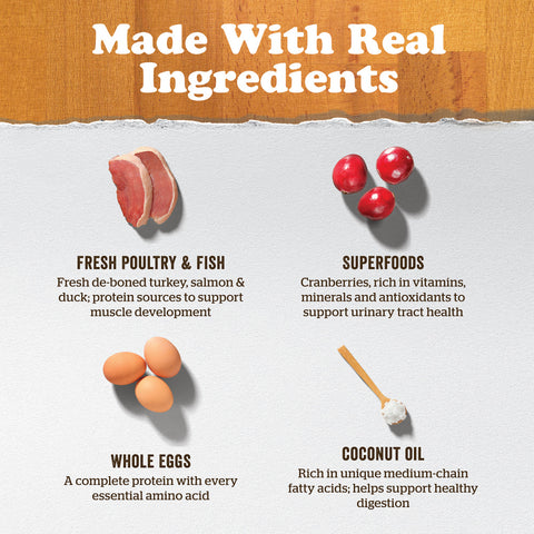 De-boned turkey, potatoes, peas, pea fiber, potato flour, whole dried egg, natural flavor, flaxseed, canola oil (preserved with mixed tocopherols), de-boned salmon, de-boned duck, alfalfa, coconut oil (preserved with mixed tocopherols), calcium carbonate, tomato, apples, carrots, pumpkin, sweet potatoes, squash, bananas, blueberries, cranberries, blackberries, pomegranate, papayas, lentils, broccoli, cottage cheese, DL-methionine, taurine, choline chloride, sodium chloride, dried chicory root, phosphoric acid, vitamins (vitamin E supplement, niacin, L-ascorbyl-2-polyphosphate (a source of vitamin C), thiamine mononitrate, biotin, vitamin A supplement, d-calcium pantothenate, beta-carotene, riboflavin, pyridoxine hydrochloride, vitamin B12 supplement, vitamin D3 supplement, folic acid), minerals (zinc proteinate, ferrous sulfate, zinc oxide, iron proteinate, copper sulfate, sodium selenite, copper proteinate, manganese proteinate, manganous oxide, calcium iodate), dried Lactobacillus acidophilus fermentation product, dried Enterococcus faecium fermentation product, L-lysine, potassium chloride, yucca schidigera extract, L-carnitine, dried rosemary.Guaranteed Analysis
