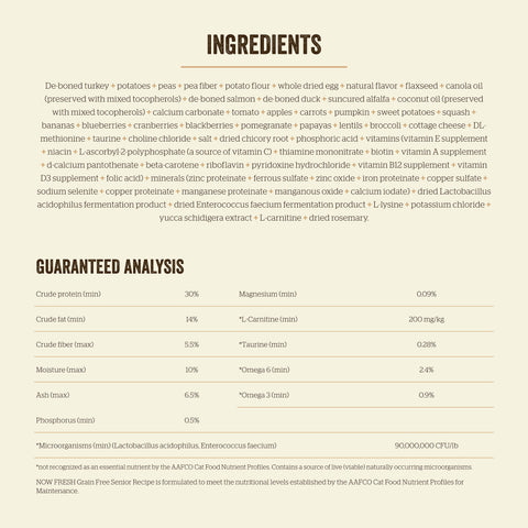 NOW FRESH Recipe for senior cats is made simply with only the highest-quality ingredients, like fresh turkey, salmon & duck, antioxidant-rich superfoods, and pre + probiotics, with no by-product or meat meals.