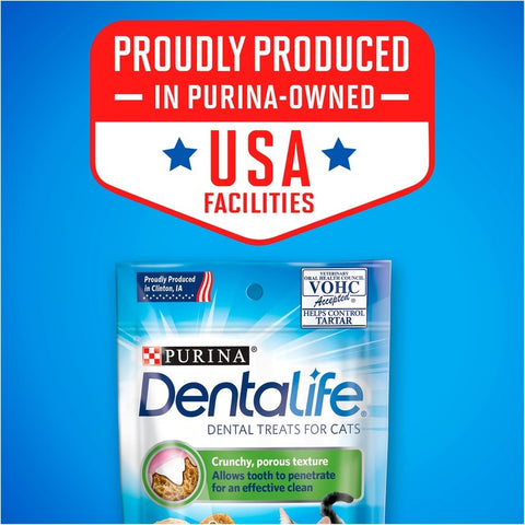 Start a regular oral health routine for your cat with Purina DentaLife Tasty Chicken Flavor adult cat dental treats. The tasty chicken flavor tempts her at snack time, and the scientifically tested design helps to reduce tartar buildup with every tooth-scrubbing bite. She's sure to love the crunchy texture, and you can rest easy knowing she's getting a tasty treat made from wholesome ingredients and without any artificial colors or flavors. Use these treats, along with a regular brushing routine and regular visits to the veterinarian, to help help care for your cat's oral health and give your cat a crunchy treat that cleans her teeth with every bite. We package these treats in a convenient resealable pouch to help preserve freshness and make it easy to serve the right portion for your adult cat whenever she wants a delicious treat. For cats who love a variety of mouthwatering flavors at snack time, consider rotating between these treats and our equally scrumptious Purina DentaLife Savory Salmon Flavor variety. We know you care about serving your cat wholesome, quality treats and snacks. That's why we work hard to make quality the top priority in every cat food and treat we produce. Our team of dedicated experts performs strict quality and safety checks throughout every step in the manufacturing process, so you can rest easy knowing she's getting a delicious and safe snack produced by a trusted brand. The science behind Purina DentaLife treats for cats is backed by our more than 90 years of research and experience making pets' lives better all over the world. So offer your feline friend Purina DentaLife Tasty Chicken Flavor adult cat dental treats as a tasty part of her regular routine, and show her she's the center of your world.