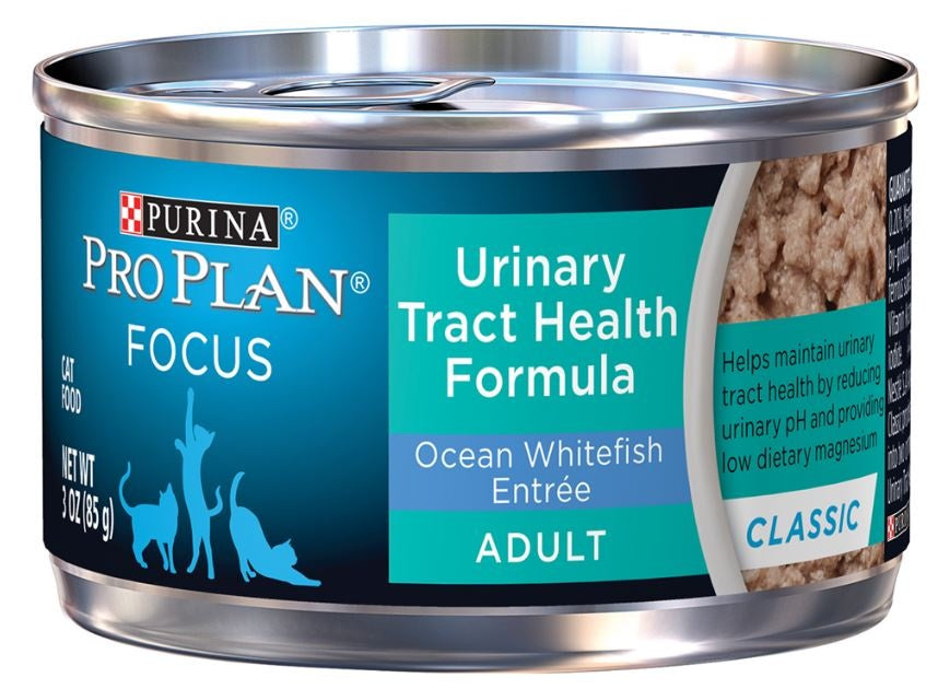 Pro Plan Focus Urinary Tract Health Formula Ocean Whitefish Entree Classic is specially designed to help maintain your cat's urinary health by reducing urinary pH and providing low dietary magnesium. This formula is made with real ocean whitefish and an excellent taste. Every cat is special and you want the best for her. With over 50 formulas, Purina Pro Plan can help you find our best cat food to meet your cat's unique needs. Feed adult cats 1.0 oz per pound of body weight daily, divided into two or more meals. Vary amounts according to your cat's needs. Feed only with cat foods intended for urinary tract health. Pro Plan Focus Urinary Tract Health Formula should not be fed to pregnant or nursing cats or to kittens. For your pet's health, see your veterinarian regularly. Refrigerate unused portion.