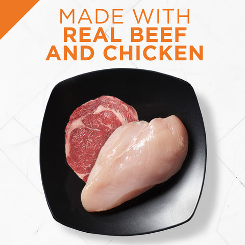 Water sufficient for processing, beef, liver, wheat gluten, meat by-products, chicken, corn starch-modified, artificial and natural flavors, salt, soy protein concentrate, added color, tricalcium phosphate, potassium chloride, taurine, choline chloride, thiamine mononitrate, Vitamin E supplement, zinc sulfate, ferrous sulfate, niacin, calcium pantothenate, Vitamin A supplement, menadione sodium bisulfite complex (source of Vitamin K activity), copper sulfate, manganese sulfate, pyridoxine hydrochloride, riboflavin supplement, Vitamin B-12 supplement, biotin, folic acid, Vitamin D-3 supplement, and potassium iodide