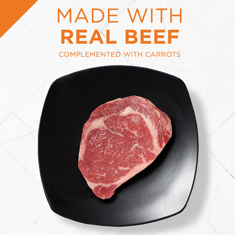 Water sufficient for processing, beef, liver, wheat gluten, meat by-products, carrots, corn starch-modified, artificial and natural flavors, salt, corn oil, soy protein concentrate, tricalcium phosphate, added color, potassium chloride, taurine, choline chloride, Vitamin E supplement, thiamine mononitrate, zinc sulfate, ferrous sulfate, niacin, calcium pantothenate, Vitamin A supplement, menadione sodium bisulfite complex (source of Vitamin K activity), copper sulfate, manganese sulfate, pyridoxine hydrochloride, riboflavin supplement, Vitamin B-12 supplement, biotin, folic acid, Vitamin D-3 supplement, and potassium iodideGuaranteed Analysis