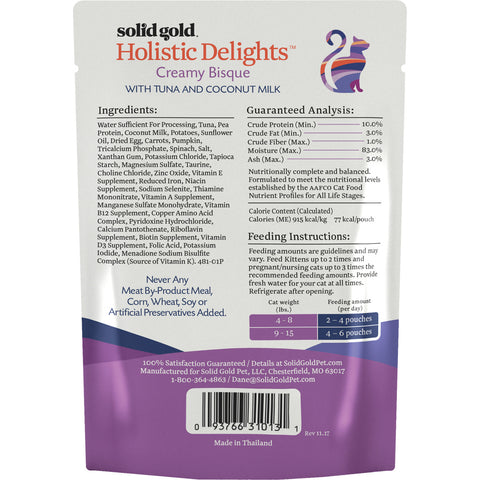 Make mealtime even more delightful with the Solid Gold Holistic Delights Creamy Bisque with Tuna & Coconut Milk Grain-Free Cat Food Pouches. With real tuna in every bite, it provides the protein-rich, grain-free goodness your kitty thrives on, all in a deliciously creamy bisque to satisfy even the pickiest eaters. The rich formula is made with coconut milk for an easy-to-digest and tasty source of calcium, and includes vitamins, minerals, antioxidants and taurine for all-around, balanced nutrition. Best of all, each easy-to-open pouch is a complete meal for your adult cat or kitten, on its own or mixed into dry food.