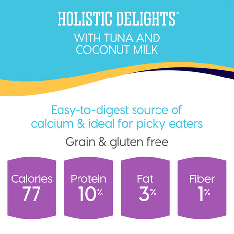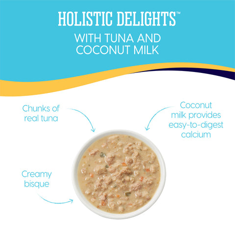 • Holistic Grain And Gluten Free Seafood And Bisque Recipe Specially Crafted For Cats Of All Life Stages, Including Kitten And Senior. Contains 24 Holistic Delights Tuna & Coconut Milk Pouches.