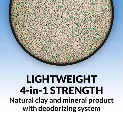 Deliver powerful odor protection to your cats' litter boxes with Purina Tidy Cats LightWeight 4-in-1 Strength clumping litter. Formulated to attack and neutralize cat litter odor caused by ammonia, urine and fecal odors, this kitty litter leaves litter boxes smelling fresh, clean and ready for your feline friends. Formulated for households with multiple cats, this 100% dust-free litter keeps ammonia odor from forming for at least two weeks when used as directed. The light, powerful clumps make scooping quick and effortless, so you can spend less time tending to each cat's litter box and more time playing with your cat companions. This litter is half the weight of leading clumping litter, making it easy to carry to your cats' litter areas whenever you need to refill their boxes. Check litter box maintenance off your to-do list with a convenient odor-neutralizing solution that will have you saying, "toss me that litter."