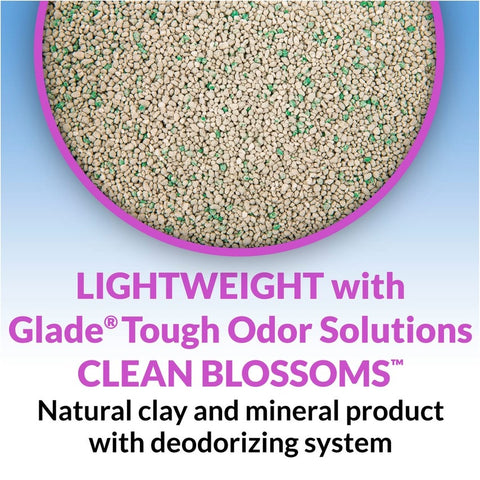 Bring the scents of spring into your home with Purina Tidy Cats LightWeight with Glade Tough Odor Solutions Clean Blossoms clumping litter. The strong clumping action makes scooping waste out of each cat's litter box easy, so you can spend less time cleaning up after your feline friends. Packaged in a convenient jug, this Tidy Cats litter makes stocking up on your cat box maintenance necessities simple, and the 100% dust-free formula ensures this litter pours clean into each box. The odor-neutralizing technology defends against strong smells, and the powerful Ammonia Blocker prevents ammonia odors from forming for at least two weeks when used as directed, helping your cats feel happy about using their boxes each day. This litter combines the powerful odor-fighting action of Tidy Cats and Glade, two trusted brands, so you can rest easy knowing you're choosing a litter that works as hard as you do. Tend to the unique needs of your multiple-cat household with this Tidy Cats litter, which weighs half as much as leading clumping litter, and make cat box maintenance quick and easy. We recommend removing solid waste every day and cleaning each box with warm water and mild detergent in between litter changes. If you're switching to this formula, begin by gradually introducing it to your cats' current litter. This accustoms them to the delightful scent so they can get excited about using their boxes each day. Look to our complete line of Tidy Cats litter solutions for more ways to fight tough odors and make cleanup easy. Our Tidy Cats litter box liners let you change out batches of litter effortlessly without transferring the litter to a garbage bag, and our Tidy Cats deodorizer gives your cats' corner extra protection against odors. Put Purina Tidy Cats LightWeight With Glade Tough Odor Solutions Clean Blossoms clumping litter to work in your house, and let your cats delight in the pleasant fragrance.