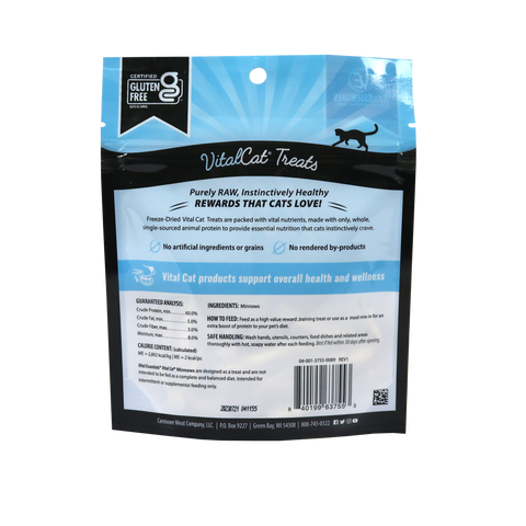 Vital Essentials Vital Cat Minnows Freeze-Dried Cat Treats are made from pure, raw minnows. We never use added hormones or antibiotics, no added fillers, flavoring or rendered by-products. Single ingredient, high protein cat treats support your cat’s health, naturally. Looking for a little love from your kitty? Then this is the treat for you. Freeze-dried Minnows are a popular pick among our cat families. Cats love the taste because we use a 48-hour slow freeze-drying process that locks in the natural flavor, texture and freshness of the minnow without compromising the nutritional value. A healthy, nutritious and delicious way to feed your cat between meals. Treats with real minnows your cat instinctively craves.