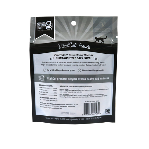 Vital Essentials is a pioneer in the raw pet food industry. Their family-owned company, located in Green Bay, Wisconsin, produces high-quality raw frozen and freeze-dried pet food, snacks, and treats. Vital Essentials uses only USDA inspected animal protein proudly made and packaged in the heartland of the U.S.A.Vital Essentials Vital Cat Rabbit Bites Freeze-Dried Cat Treats are made from pure, raw, rabbit. We never use added hormones or antibiotics, no added fillers, flavoring or rendered by-products. Limited ingredient, high protein cat treats support your cats health, naturally. These treats will have your cats hopping with joy! Freeze-dried Rabbit Bites are a great source of Vitamin A, Vitamin B6, taurine and more. Cats love the taste because we use a 48-hour slow freeze-drying process that locks in the natural flavor, texture and freshness of the meat without compromising the nutritional value. A healthy, nutritious and delicious way to feed your cat between meals. Treats with real meat your cat instinctively craves.