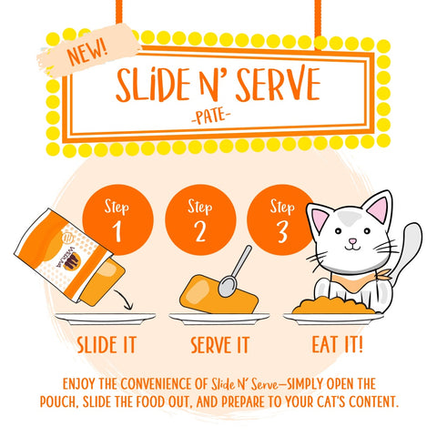 Slide N’ Serve™ Paté in a pouch! - We’re making it easier and more fun to feed our feline friends their favorite foods. Simply open the pouch, slide the food out, and prepare to your cat’s content. (And don’t forget to recycle the pouch!)