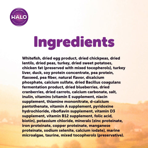 Whitefish, dried egg product, dried chickpeas, dried lentils, dried peas, turkey, dried sweet potatoes, chicken fat (preserved with mixed tocopherols), turkey liver, duck, soy protein concentrate, pea protein, flaxseed, pea fiber, natural flavor, dicalcium phosphate, calcium sulfate, dried Bacillus coagulans fermentation product, dried blueberries, dried cranberries, dried carrots, calcium carbonate, salt, inulin, vitamins (vitamin E supplement, niacin supplement, thiamine mononitrate, d-calcium pantothenate, vitamin A supplement, pyridoxine hydrochloride, riboflavin supplement, vitamin D3 supplement, vitamin B12 supplement, folic acid, biotin), potassium chloride, minerals (zinc proteinate, iron proteinate, copper proteinate, manganese proteinate, sodium selenite, calcium iodate), marine microalgae, taurine, mixed tocopherols (preservative).