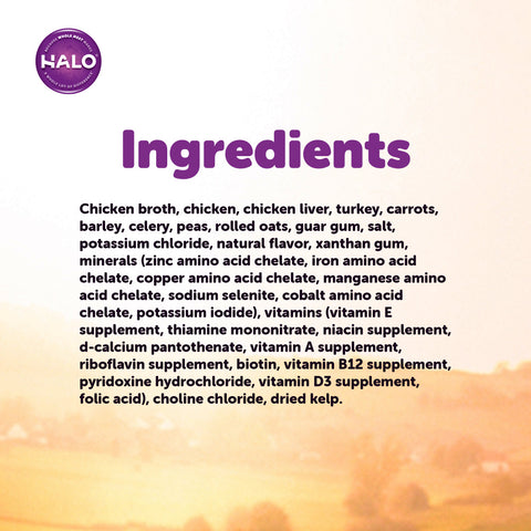 Chicken broth, chicken, chicken liver, turkey, carrots, barley, celery, peas, tricalcium phosphate, rolled oats, guar gum, potassium chloride, garlic powder, calcium citrate, xanthan gum, minerals (zinc amino acid chelate, iron amino acid chelate, copper amino acid chelate, manganese amino acid chelate, sodium selenite, cobalt amino acid chelate, potassium iodide), vitamins (vitamin E supplement, thiamine mononitrate, niacin supplement, d-calcium pantothenate, vitamin A supplement, riboflavin supplement, biotin, vitamin B12 supplement, pyridoxine hydrochloride, vitamin D3 supplement, folic acid), salt, choline chloride, dried kelp.Guaranteed Analysis