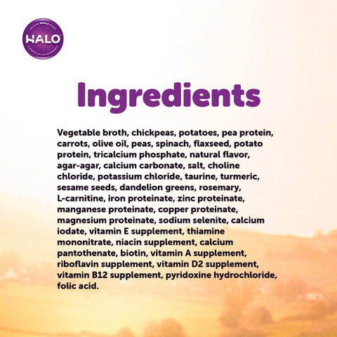 Vegetable Broth, chickpeas, potatoes, pea protein, carrots, olive oil, peas, spinach, flaxseed, potato protein, tricalcium phosphate, natural flavor, agar-agar, salt, calcium carbonate, choline, chloride, potassium chloride, taurine, turmeric, sesame seeds, dandelion greens, rosemary, L-carnitine, iron proteinate, sodium selenite, calcium iodate, vitamin E supplement, thiamine, mononitrate, niacin supplement, calcium pantothenate, biotin, vitamin A supplement, riboflavin supplement, vitamin D2 supplement, vitamin B12 supplement, pyridoxine hydrochloride, folic acidgolden algae chloride potassium chloride tumeric sesame dandelion greens rosemary minerals vitamins