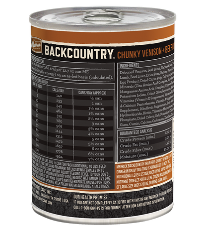 Merrick Backcountry Grain Free Wet Dog Food Chunky Venison & Beef Dinner in Gravy- Real deboned venison and beef in every serving for a canned dog food packed with quality protein- Gluten free dog food made without grains offers complete and balanced nutrition- Natural wet food for dogs with added vitamins and minerals to provide complete nutrition- Grain free wet dog food with a hearty gravy that provides moisture and flavor to your dog's diet