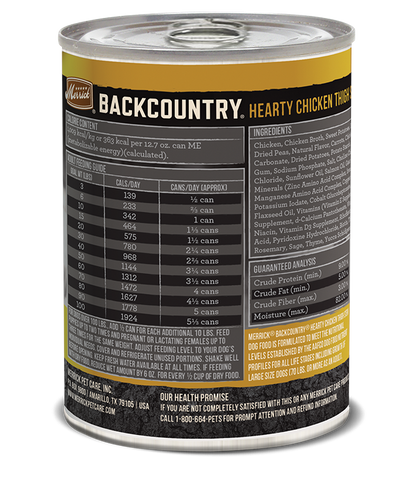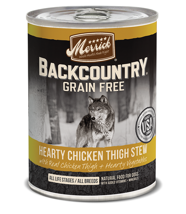 Merrick Backcountry Grain Free Wet Dog Food Hearty Chicken Thigh Stew- Real deboned chicken is always the first ingredient in this gluten free dog food- Also contains real, whole vegetables and a savory gravy for added flavor and moisture- High-quality protein helps build and maintain healthy muscle tissue and energy levels in dogs- Natural dog food with added vitamins and minerals