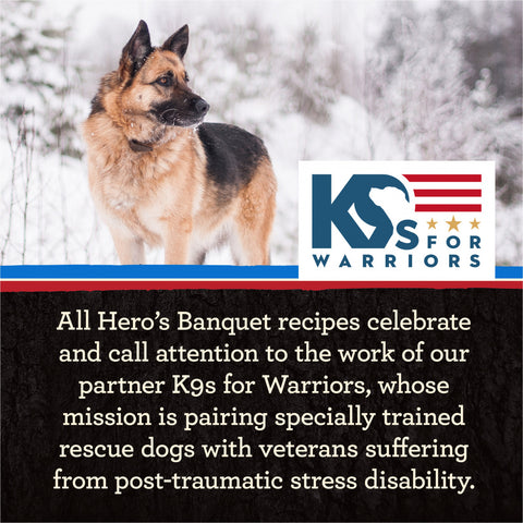 Hero's Banquet recipes celebrate the work of our partner K9s For Warriors, whose mission is pairing specially trained rescue dogs with veterans suffering from post-traumatic stress disability (PTSD). Hero's Banquet is available nationally year-round at Petco, independent pet supply stores and online.