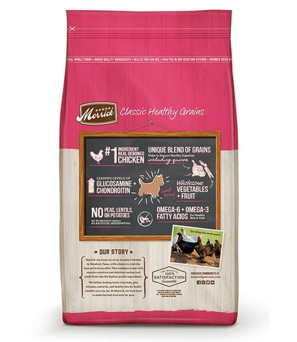 Merrick Classic Small Breed Recipe Dry Dog Food provides natural nutrition from a wholesome balance of protein, whole grains, fruits, and vegetables all in a smaller kibble size perfect for the pint sized pals in your life! Merrick Classic Small Breed Recipe Dry Dog Food starts with real, farm fresh deboned chicken for high quality protein. Fresh produce and a healthy blend of whole grains including oatmeal and ancient grains like quinoa, while high levels of Omega 6 and Omega 3 fatty acids aid in a healthy skin and coat, accompanied with glucosamine and chondroitin to support healthy joints and hips