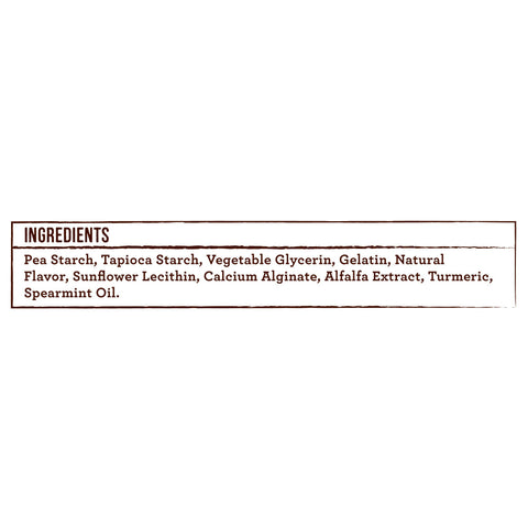 Pea Starch, Tapioca Starch, Vegetable Glycerin, Gelatin, Natural Flavor, Sunflower Lecithin, Calcium Alginate, Alfalfa Extract, Turmeric, Spearmint Oil.Guaranteed Analysis