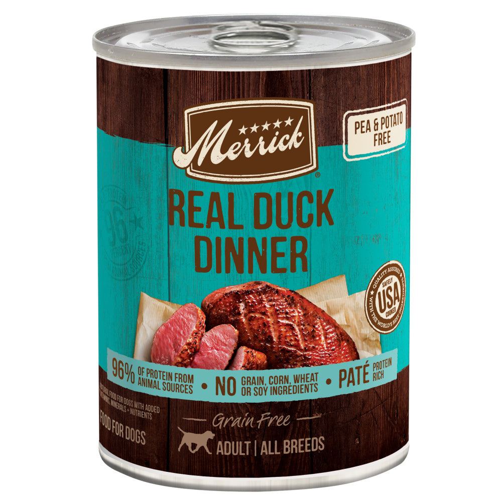 Merrick Grain Free 96% Real Duck Canned Dog Food starts with real, USDA-inspected deboned duck. Packed with all the vitamins and nutrients your dog needs, it's 96% meat, meaning high protein, the most important ingredient in a dog's diet. As with all of Merrick’s recipes, their ingredients are sourced fresh and locally in the United States. Great as a topper for your dog’s regular dry kibble or as a stand-alone meal, Merrick Grain Free 96% Real Duck Canned Dog Food is sure to be a hit!