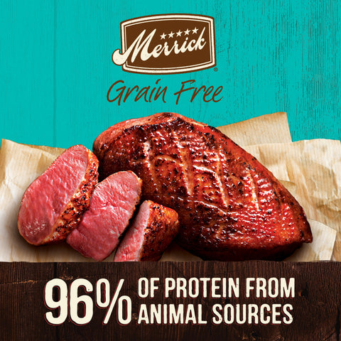 Merrick isn't your typical pet food company, and Merrick doesn't just make pet food. Merrick makes the best food ever for the best pet ever. Yours. The five star promise from Merrick is what's guaranteed to each and every dog and cat, along with their owners. Local growers, real whole foods, their own kitchen, balanced nutrition, and health you can see. Merrick creates real, wholesome recipes using USDA-inspected deboned meat and fresh produce for industry leading levels of protein, glucosamine and chondroitin. All of Merrick's foods are handcrafted in Hereford, Texas from USA farmers they know and trust. With no additives, sweeteners, colors or preservatives, real whole foods including high quality meats and fresh caught fish are the core of every Merrick dog and cat food. Merrick has been cooking their own foods in their own Texas kitchen for over 25 years. They stand behind their products with a 100% guarantee, promising that your dog or cat will be happier and healthier. You are what you eat, so why not feed your best friend the very best?