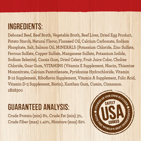 Deboned Beef, Beef Broth, Vegetable Broth, Beef Liver, Dried Egg Product, Potato Starch, Natural Flavor, Flaxseed Oil, Calcium Carbonate, Sodium Phosphate, Salt, Salmon Oil, Minerals (Potassium Chloride, Zinc Sulfate, Ferrous Sulfate, Copper Sulfate, Manganese Sulfate, Potassium Iodide, Sodium Selenite), Cassia Gum, Dried Celery, Fruit Juice Color, Choline Chloride, Guar Gum, Vitamins (Vitamin E Supplement, Niacin, Thiamine Mononitrate, Calcium Pantothenate, Pyridoxine Hydrochloride, Vitamin B-12 Supplement, Riboflavin Supplement, Vitamin A Supplement, Folic Acid, Vitamin D-3 Supplement, Biotin), Xanthan Gum, Cumin, Cinnamon