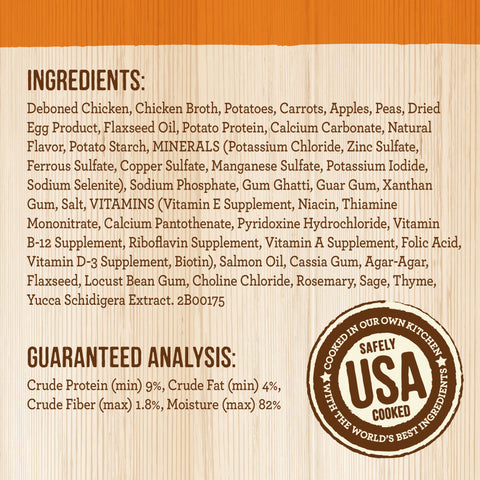 Deboned Chicken, Chicken Broth, Potatoes, Carrots, Apples, Peas, Dried Egg Product, Flaxseed Oil, Potato Protein, Calcium Carbonate, Natural Flavor, Potato Starch, Minerals (Potassium Chloride, Zinc Sulfate, Ferrous Sulfate, Copper Sulfate, Manganese Sulfate, Potassium Iodide, Sodium Selenite), Sodium Phosphate, Gum Ghatti, Guar Gum, Xanthan Gum, Salt, Vitamins (Vitamin E Supplement, Niacin, Thiamine Mononitrate, Calcium Pantothenate, Pyridoxine Hydrochloride, Vitamin B-12 Supplement, Riboflavin Supplement, Vitamin A Supplement, Folic Acid, Vitamin D-3 Supplement, Biotin), Salmon Oil, Cassia Gum, Agar-Agar, Flaxseed, Locust Bean Gum, Choline Chloride, Rosemary, Sage, Thyme, Yucca Schidigera Extract.Guaranteed Analysis