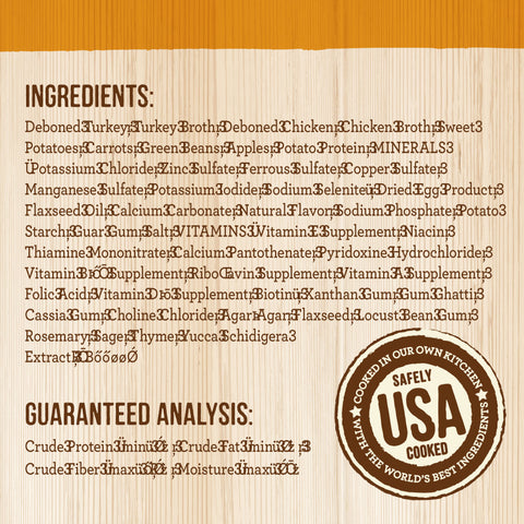 Deboned Turkey, Turkey Broth, Deboned Chicken, Chicken Broth, Sweet Potatoes, Carrots, Green Beans, Apples, Potato Protein, Minerals (Potassium Chloride, Zinc Sulfate, Ferrous Sulfate, Copper Sulfate, Manganese Sulfate, Potassium Iodide, Sodium Selenite), Dried Egg Product, Flaxseed Oil, Calcium Carbonate, Natural Flavor, Sodium Phosphate, Potato Starch, Guar Gum, Salt, Vitamins (Vitamin E Supplement, Niacin, Thiamine Mononitrate, Calcium Pantothenate, Pyridoxine Hydrochloride, Vitamin B-12 Supplement, Riboflavin Supplement, Vitamin A Supplement, Folic Acid, Vitamin D-3 Supplement, Biotin), Xanthan Gum, Gum Ghatti, Cassia Gum, Choline Chloride, Agar-Agar, Flaxseed, Locust Bean Gum, Rosemary, Sage, Thyme, Yucca Schidigera Extract.Guaranteed Analysis