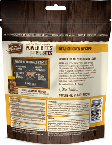Merrick Power Bites are soft and chewy natural treats, with big taste and significant levels of powerful protein packed into every bite. Merrick is excited to now offer Big Bites for large breed dogs. Larger star-shaped treats are perfect for training and rewarding large-breed dogs. In addition to bigger bite sizes, Big Bites include glucosamine for hip and joint health, as well as Omega 3 and Omega 6 fatty acids that support healthy skin and coat. Big Bites are grain-free and gluten-free, without sorbic acid.
