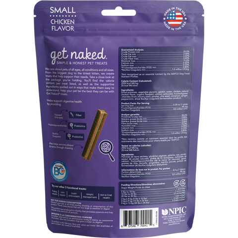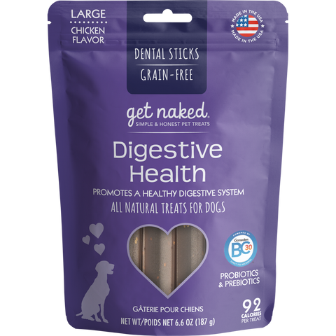 Get Naked® Digestive Health dental chew sticks are specially formulated with a grain free blend of dietary fiber, prebiotics, and naturally occurring live microorganisms (probiotics) to help maintain a healthy digestive system.