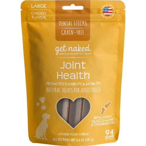 Dogs love to run and play making it important for them to have healthy joints. Get Naked® Joint Health dental chew sticks are grain free treats fortified with glucosamine, chondroitin, and Omega 3 fatty acids to help support flexibility and mobility in adult and senior dogs.