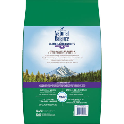 Help bring out your best bud’s best with the select, simple, premium ingredients and delicious taste of Natural Balance® L.I.D. Limited Ingredient Diets® Lamb & Brown Rice Large Breed Formula Dry Dog Food. This grain-inclusive premium dog food is made with no gluten ingredients. The first ingredient is real lamb, which provides amino acids — to help build the strong muscles your dog needs to make the most of your adventures together. Meanwhile, whole-grain brown rice contains fiber to help support healthy digestion. And with essential vitamins and minerals, this delicious lamb and brown rice formula dog food is complete and balanced to meet the unique nutritional needs of your large breed dog. Designed for large jaws and teeth, this kibble encourages large breed dogs to chew properly and eat slower, while the crunchy texture helps promote clean teeth and healthy gums. To top it all off, like all Natural Balance products, it’s backed by our Buy With Confidence® promise, so you can rest assured that it’s healthy, tasty and safe.