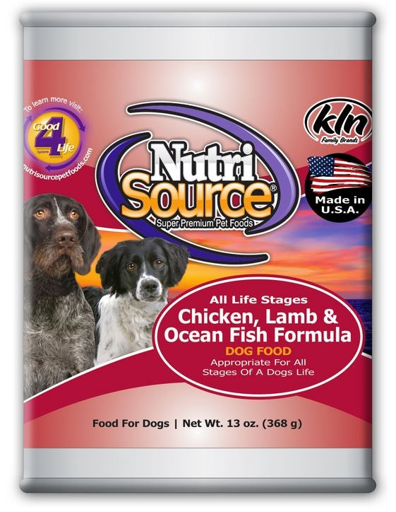 NutriSource Adult Chicken Lamb and OceanFish Canned Dog Food uses farm fresh chicken, lamb, and other high quality ingredients to create an easy to digest pate canned food for your pup! This recipe also has added prebiotics and highly digestible minerals for immune and growth support. Nutrisource recipes always include their Good 4 Life system with ingredients that work together to promote gut health often showing health improvements within the first feeding!