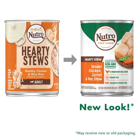 Your dog will do a happy dance when you open a can of NUTRO HEARTY STEW Tender Chicken, Carrot & Pea Stew. Farm-raised chicken is the first ingredient in this delicious grain-free canned wet dog food, and it's rich in nutrients and full of flavor that dogs big and small go crazy for. This NUTRO recipe is made with non-GMO ingredients,* NO chicken by-product meal, NO corn, wheat, or soy, and NO artificial flavors, colors, or preservatives. Plus, it’s made at facilities committed to zero waste to landfill. Give your dog NUTRO HEARTY STEW recipes with the NUTRO FEED CLEAN logo every day for ultimate tail wags. * Trace amounts of genetically modified material may be present due to potential cross-contact during manufacturing.