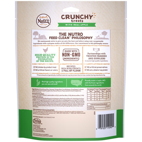 Dogs love the crunchy texture and natural flavors of NUTRO Crunchy Dog Treats. These 100% natural dog treats are made with non-GMO ingredients*, containing: NO chicken by-product meal, NO artificial flavors or colors, NO artificial preservatives, NO corn, wheat, or soy protein. Our NUTRO Treats for Dogs with Real Apple are thoughtfully prepared to give your canine companion a delicious, healthy bite-size snack, to reward an active and healthy lifestyle. * Trace amounts of genetically modified material may be present due to cross contact during manufacturing.