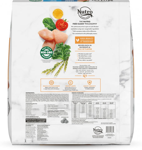 Nutro Wholesome Essentials Large Breed Puppy Farm-Raised Chicken, Brown Rice & Sweet Potato Recipe Dog Food always starts with great tasting, farm-raised chicken as the first ingredient and is made with high-quality nutrients like glucosamine and chondroitin. This dog food contains calcium to build strong bones and joints and omega 3 fatty acids like DHA to support the growth and development needs of your large breed puppy. . NUTRO Food for Dogs always follows the The Nutro Feed Clean philosophy, is always made with Non-GMO* Ingredients and contains no artificial flavors, colors or preservatives.